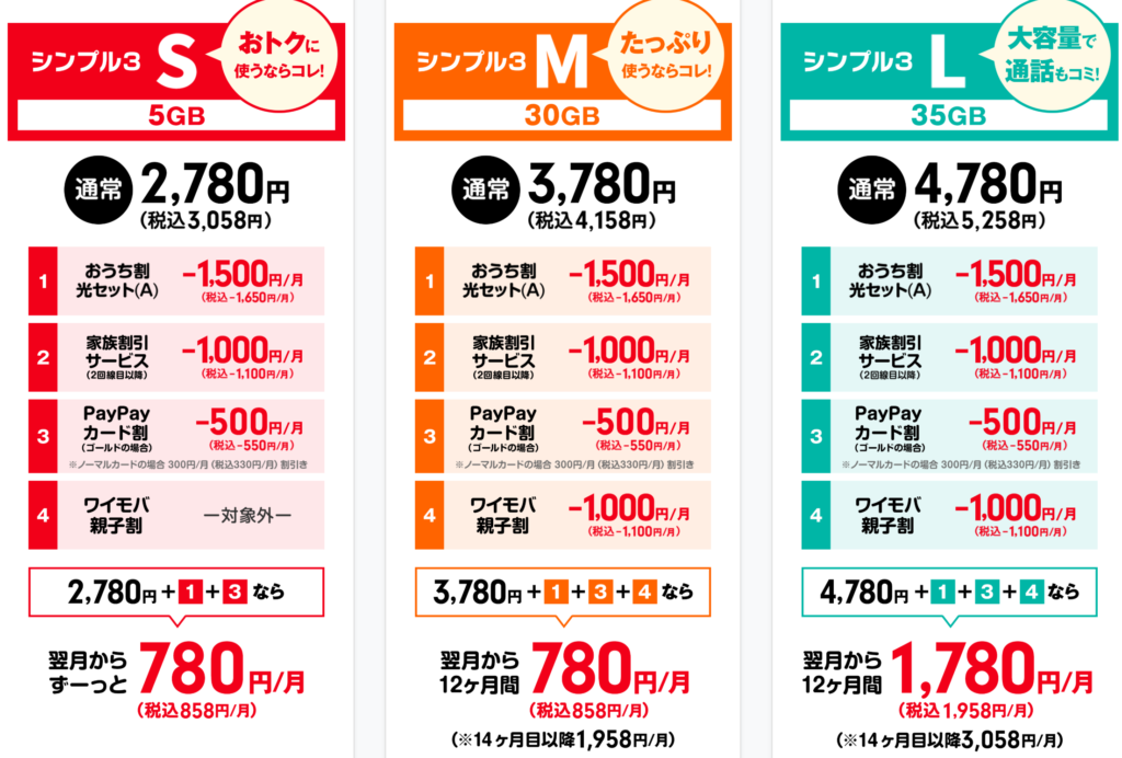 ワイモバイルの料金は主に3つです。
