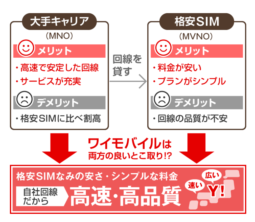 大手キャリア(ドコモ・au・ソフトバンク)の回線を借りて運営している通信サービスです。
